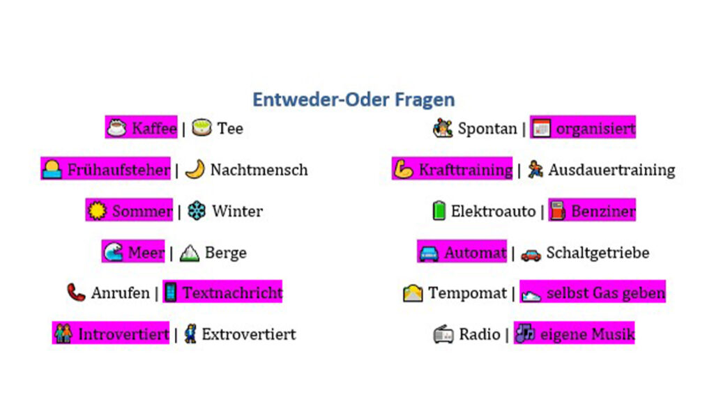 Ehrgeizig, humorvoll, zuverlässig, willensstark, lernbereit, pünktlich wie eine Schweizer-Uhr – von meiner Mutter 😊.